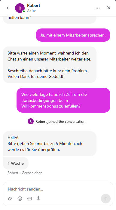 💎 Besonders positiv aufgefallen ist, dass man zwar erst mit einem Chatbot kommunizieren musste, dieser uns aber überraschend schnell an einen echten Mitarbeiter weitergeleitet hat, als wir danach fragten.